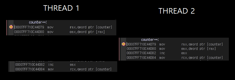 - 쓰레드 1번은 rax, eax를 사용하고 멈춘 후 쓰레드 2번이 들어와 모든 값을 실행하고 나간다면 쓰레드 1번이 꼬이게 됨