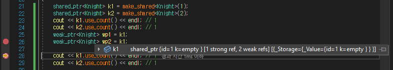 weak_ptr<Knight> wp1 = k1; // k1 -> weak 1, strong 1