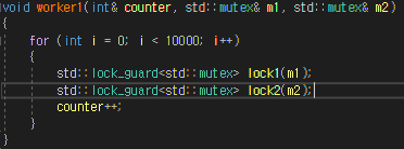 void worker1(int& counter, std::mutex& m1, std::mutex& m2)