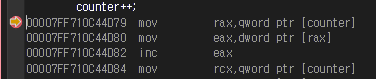 - 밑의 그림처럼 디버깅을 해서 어셈블리어를 확인해 본다면 명령을 한줄 한줄 CPU가 처리